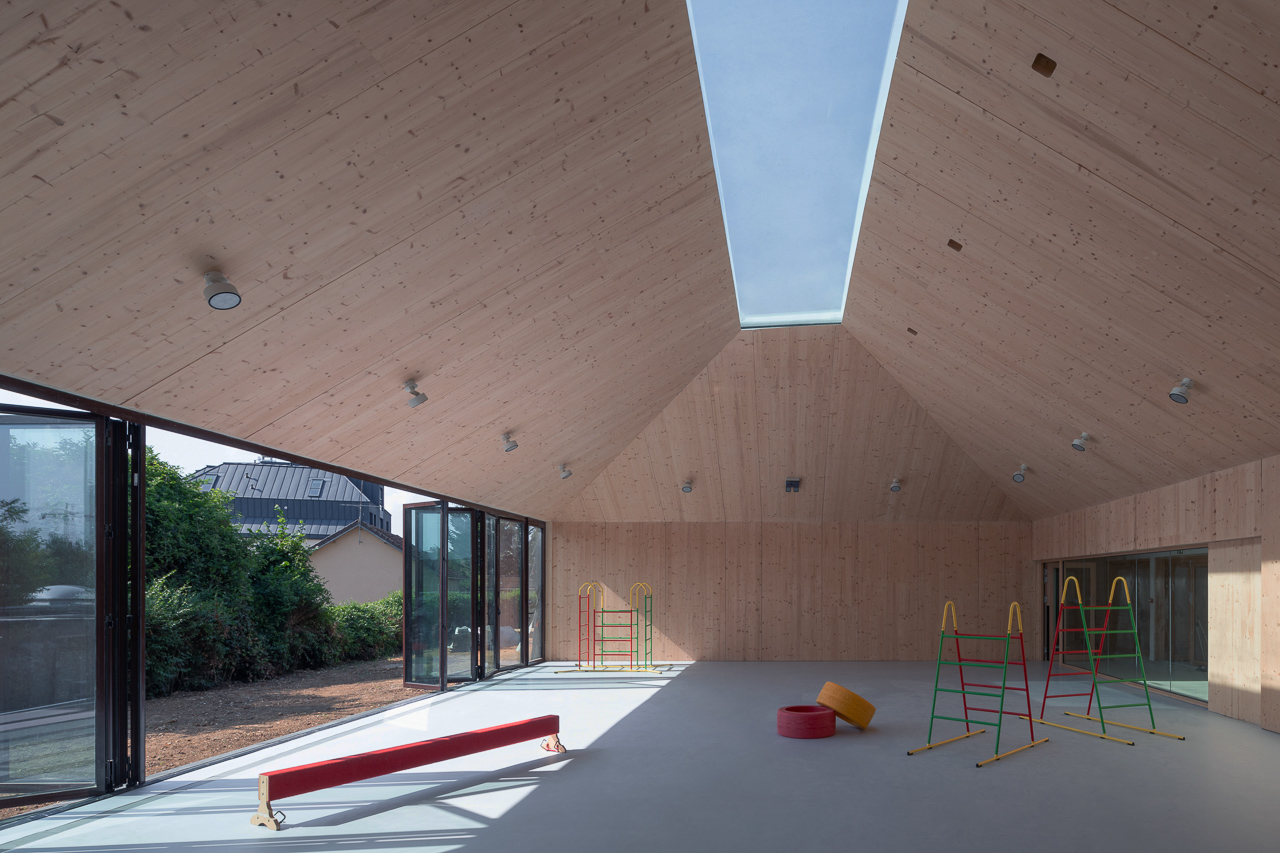 Mais la pièce la plus impressionnante est bien la salle d’activités, où un plafond de verre du plus bel effet, de 8m 20 de long et 2 m 40 de large, permet d’obtenir 20 % de lumière supplémentaire. « L’ensemble est travaillé comme une pyramide qu’on aurait selectionné dans sa partie supérieure. Ce plafond a été très technique. C’est l’un des plus grands verres français et c’est vraiment un élément structurel », s’enthousiasme l’architecte. Et il a de quoi car, par beau temps, la luminosité entrant dans la pièce est très agréable. Cette salle d’activités dispose également d’un large bandeau vitré amovible qui s’ouvre sur une bande de jardin pédagogique.