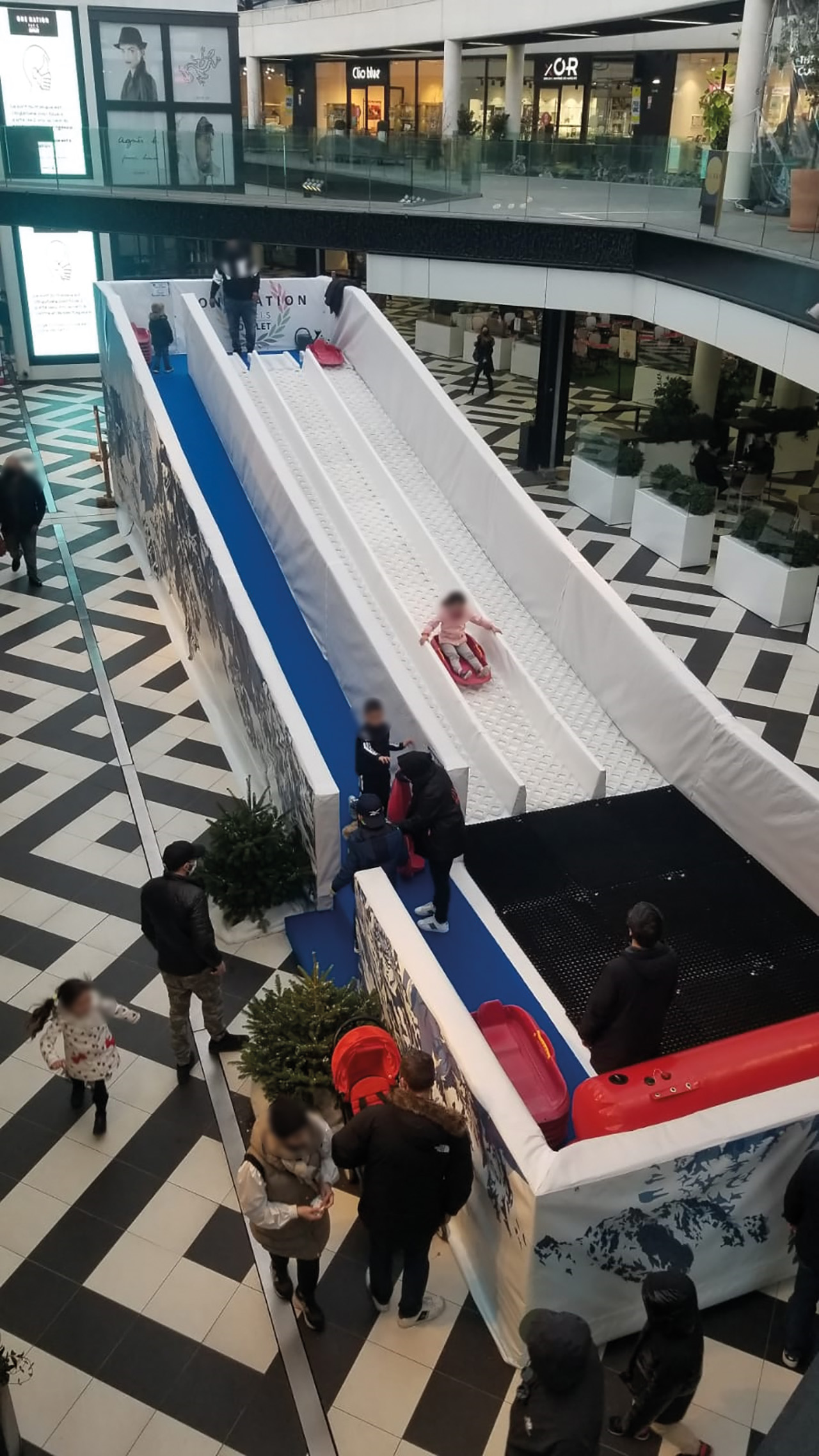 Parmi les sports d’hiver proposés, on peut par exemple citer, en face de Rossignol, une piste de luge synthétique de 15 m de long à dévaler dans une grosse bouée. Face à Haribo, il est possible de tester l’animation Mario à la montagne. Un jeu de voitures téléguidées sur le thème Mario, dans un décor de glace. Animation fermée en cas de pluie.
